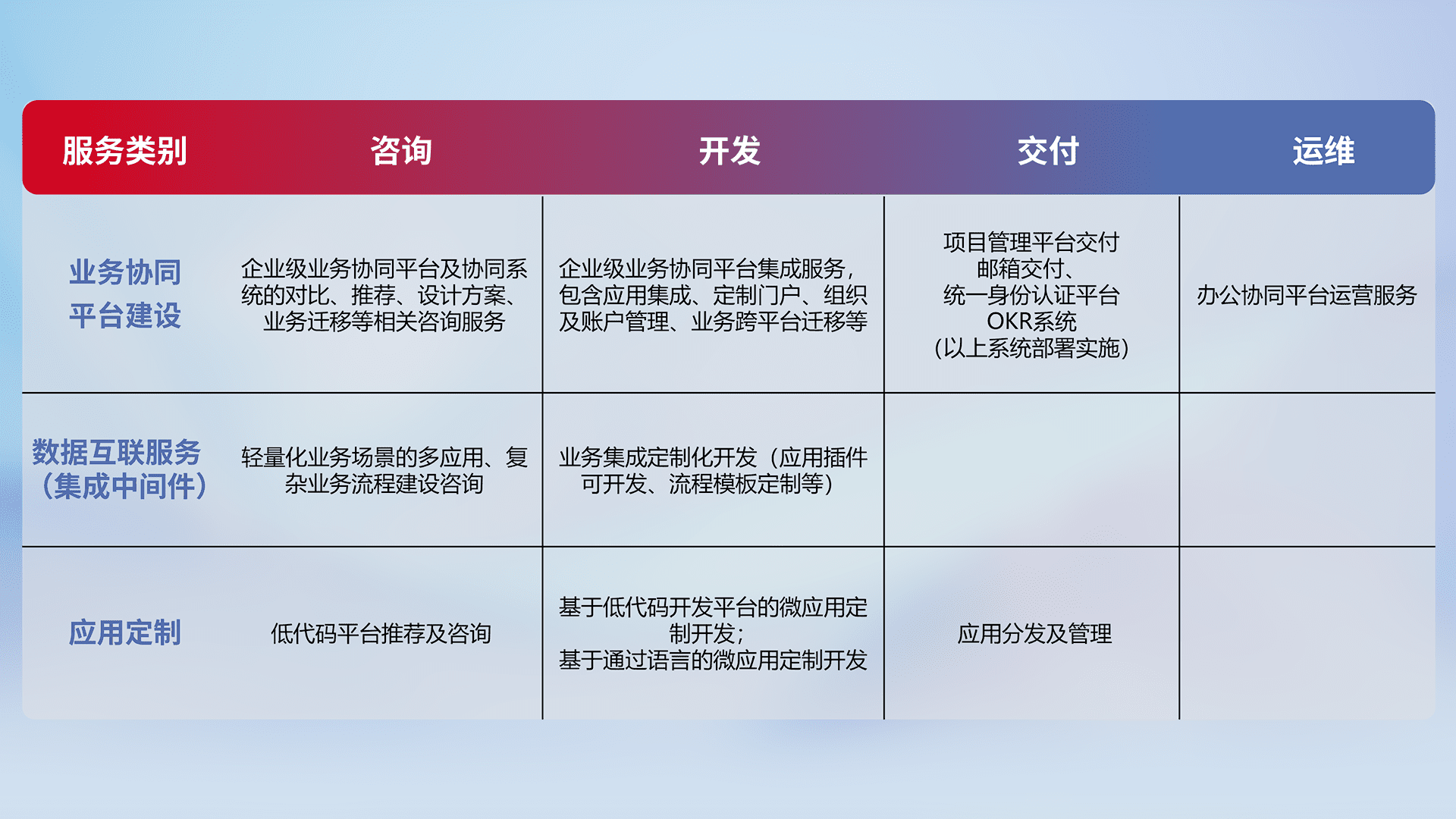 针对钉钉、、企微、、、IDaas等平台级产品提供产品的规划、、方案、、交付、、定制化开发等服务,,实现如统一协同办公、、、智能客户服务、、、混合会议管理、、智能数据查询、、、、等业务场景,,实现数字化转型。。