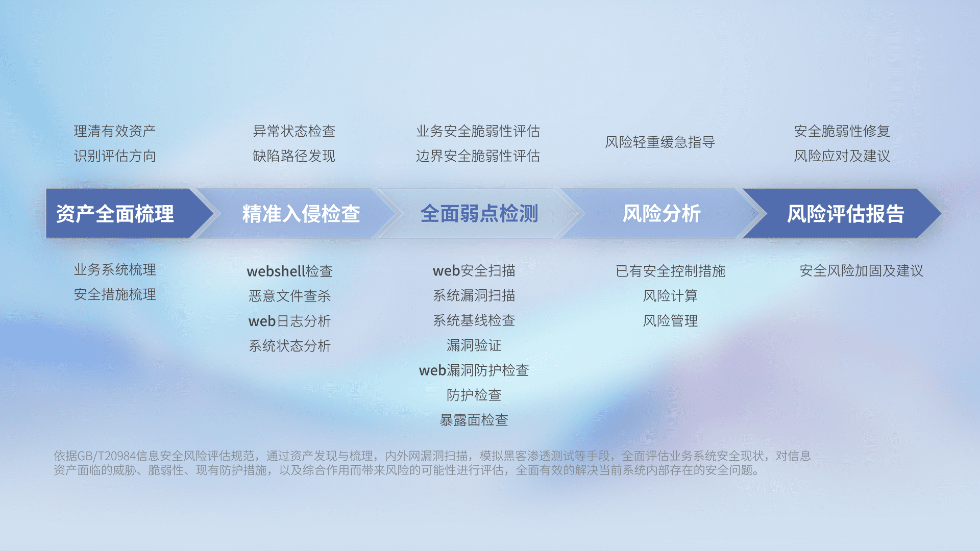 针对客户行业特性,,,以专业的安全服务+多厂商联合解决方案提供专属的一站式安全管理服务,,,帮助客户全面感知网络空间威胁,,基于识别、、检测、、分析、、、、防护、、监测、、、响应的服务理论模型,,,,从方案咨询、、、、集成交付、、、、评估验证、、优化加固、、、运维运营,,,致力于为客户提供完整的闭环管理式安全服务。。。。以实战经验为客户打造高抵御风险的安全体系,,,帮助客户发现威胁、、、、对抗威胁、、处置威胁,,不断积累安全对抗能力,,,,持续保障数字化安全。。。